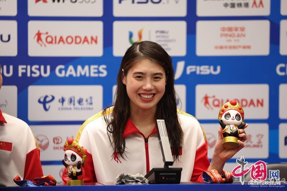 8月1日,成都大運(yùn)會(huì)女子4×100米自由泳接力決賽舉行,賽后中國選手張雨霏在發(fā)布會(huì)上向記者展示“蓉寶”。中國網(wǎng)記者 倫曉璇 攝