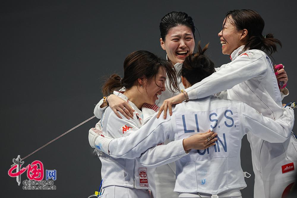 在女子重劍團(tuán)體賽中,中國(guó)女子重劍隊(duì)擊敗賽事頭號(hào)種子意大利隊(duì),選手慶祝奪得金牌。中國(guó)網(wǎng)記者 倫曉璇 攝