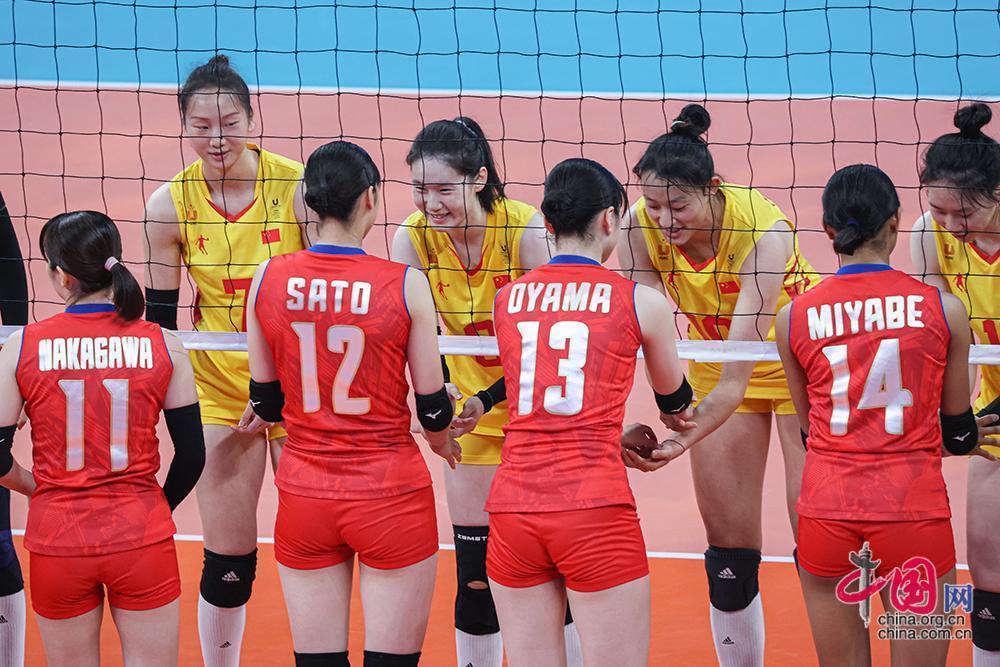 8月6日晚,成都大運會女排決賽舉行,賽前,中國隊球員與日本隊球員互相加油。中國網(wǎng)記者 倫曉璇 攝