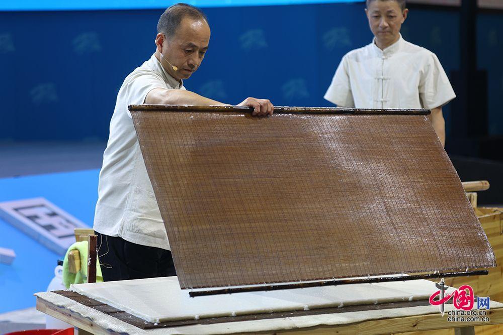 9月16日,第二屆全國技能大賽在天津開賽。圖為在第二屆全國技能大賽絕技展演活動現(xiàn)場,宣紙撈紙工人周東紅(左)展示宣紙撈紙技藝。中國網(wǎng)記者 倫曉璇 攝