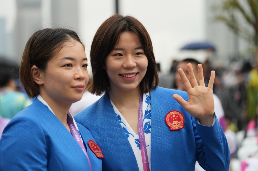 9月16日,中國體育代表團成員陳清晨(左)、賈一凡在儀式開始前合影。新華社記者 薛宇舸 攝
