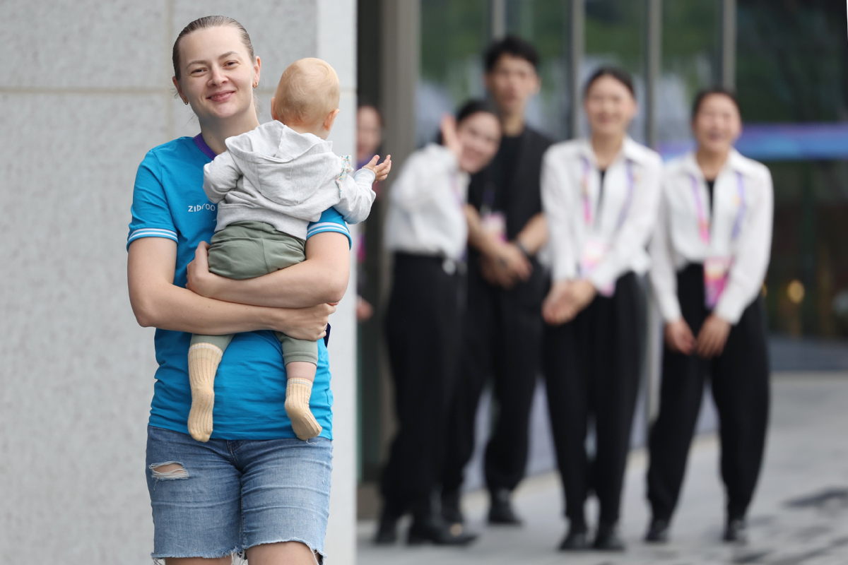 9月22日,運(yùn)動(dòng)員村內(nèi)的商業(yè)街上,抱著孩子的哈薩克斯坦運(yùn)動(dòng)員Ulyana Pistsova受到關(guān)注。中國(guó)日?qǐng)?bào)記者 魏曉昊 攝