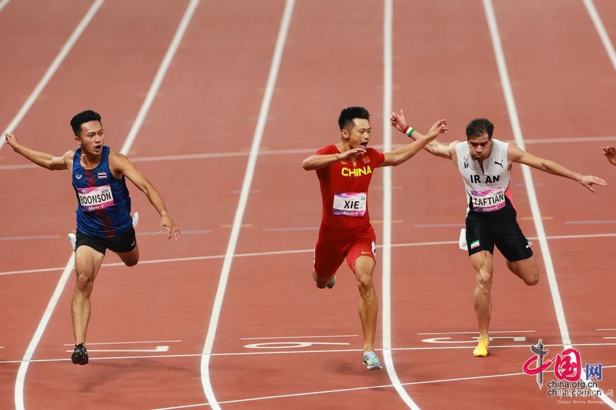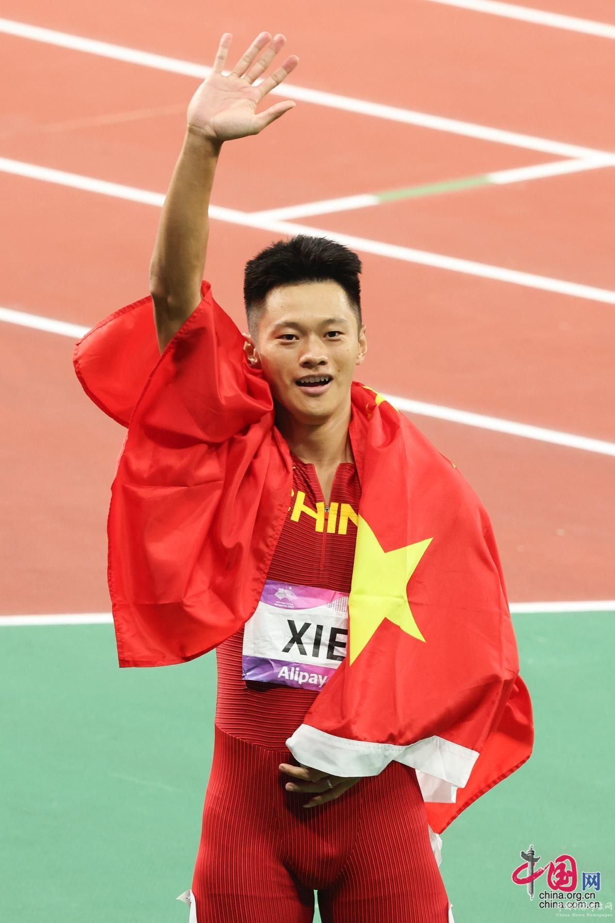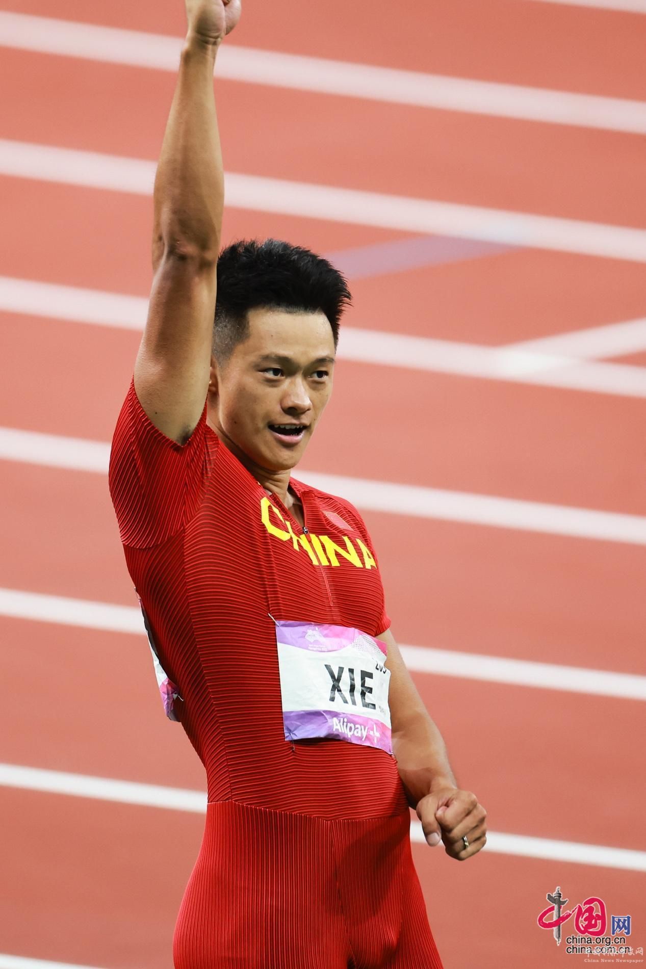 9月30日晚,杭州亞運(yùn)會(huì)男子100米決賽中,30歲的謝震業(yè)以9秒97的成績,奪得金牌。他是決賽中唯一一名突破10米大關(guān)的選手,9秒97也是他的個(gè)人最好成績。圖為謝震業(yè)奪冠后慶祝勝利。中國網(wǎng)記者 董寧 攝影