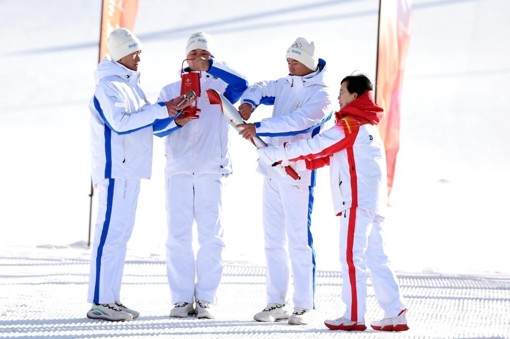 2022年2月3日,北京冬奧會(huì)火炬在河北張家口崇禮富龍滑雪場(chǎng)傳遞,圖為火種護(hù)衛(wèi)點(diǎn)燃火炬手劉芳(右一)的火炬。新華社記者駱學(xué)峰攝