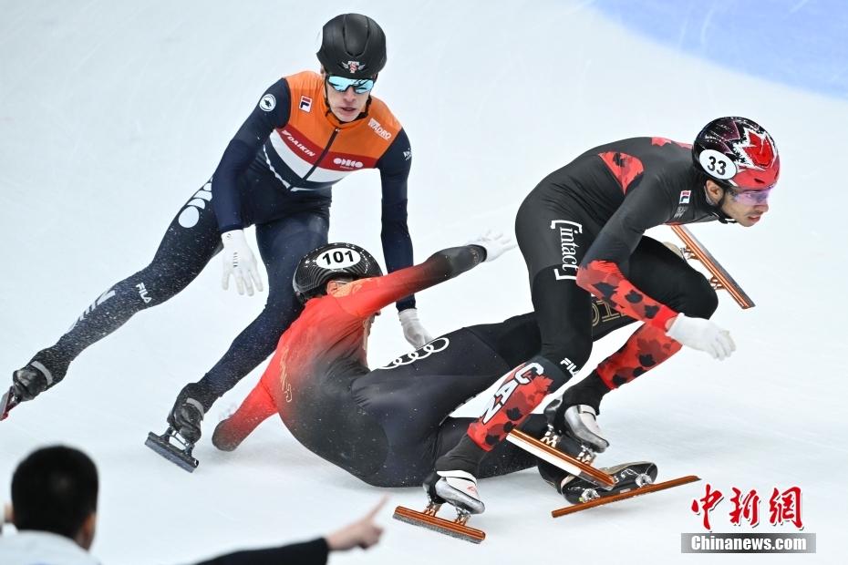 12月10日,2023-2024賽季國(guó)際滑聯(lián)短道速滑世界杯北京站的比賽在北京首都體育館進(jìn)行。在男子5000米接力決賽中,由任子威、劉少昂、孫龍、劉少林組成的中國(guó)隊(duì)以6分58秒280的成績(jī)獲得銅牌。圖為劉少林在比賽中摔倒。中新社記者 趙文宇 攝