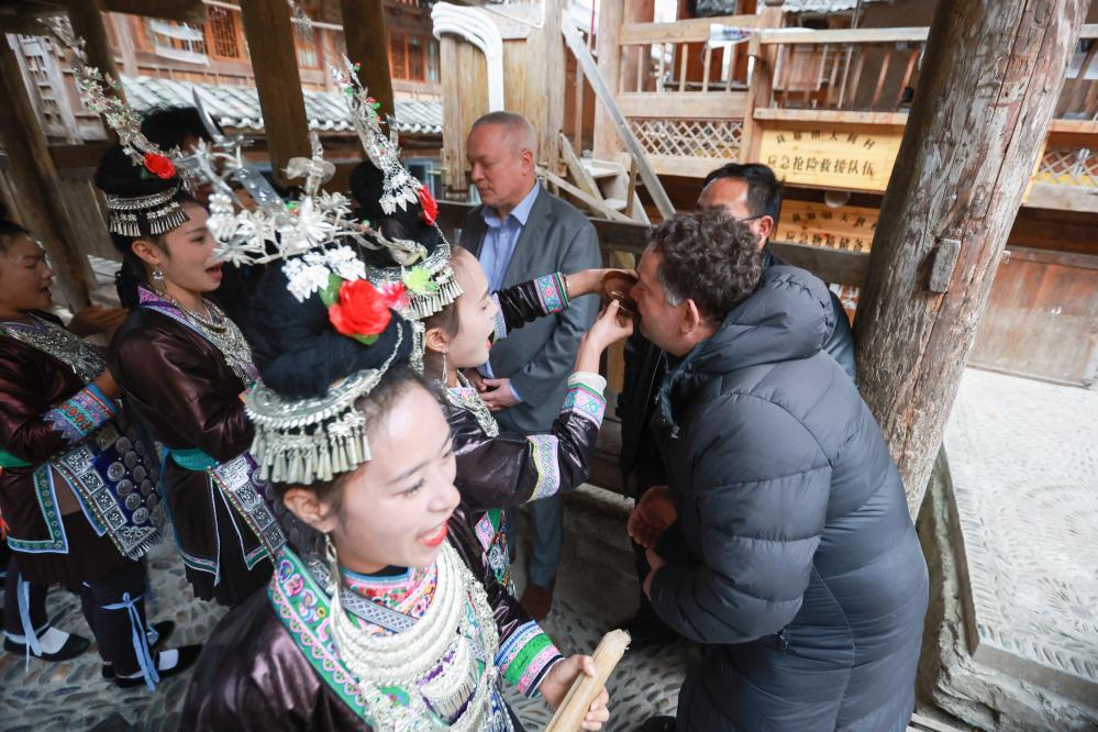 12月11日,榕江縣少數(shù)民族同胞用迎門酒歡迎“學(xué)轉(zhuǎn)英超”培訓(xùn)團隊。新華社記者 劉續(xù) 攝