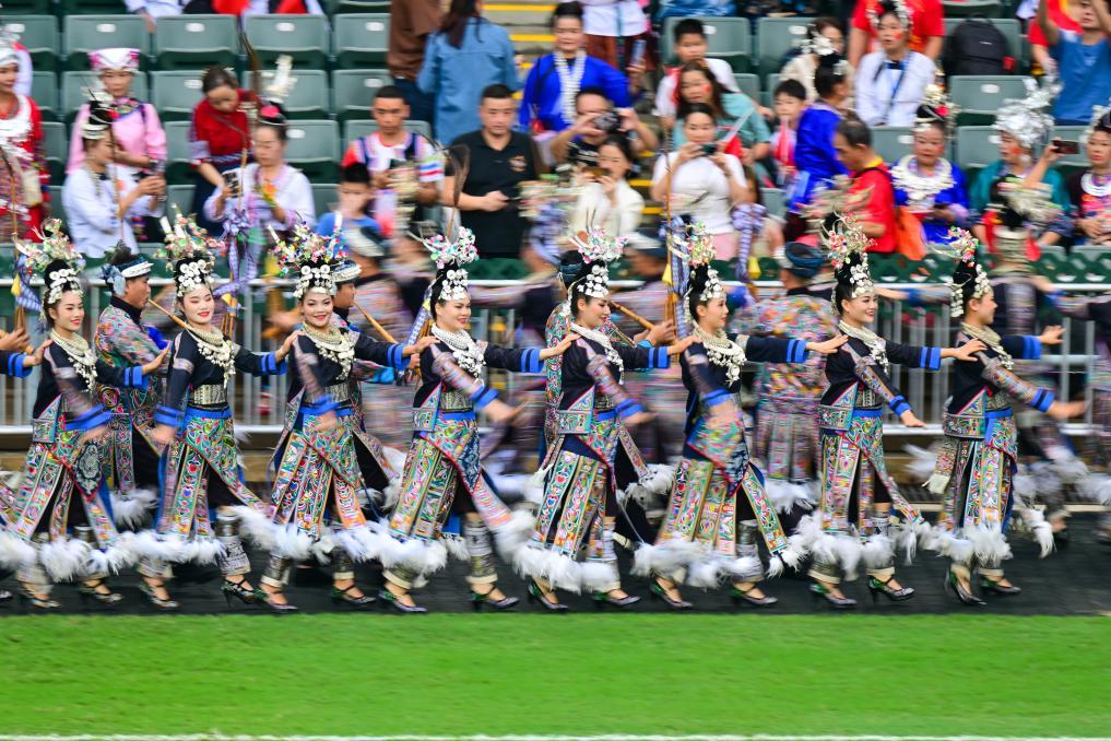 11月11日,貴州榕江“村超”啦啦隊在比賽間隙表演民族歌舞。新華社記者 朱煒 攝