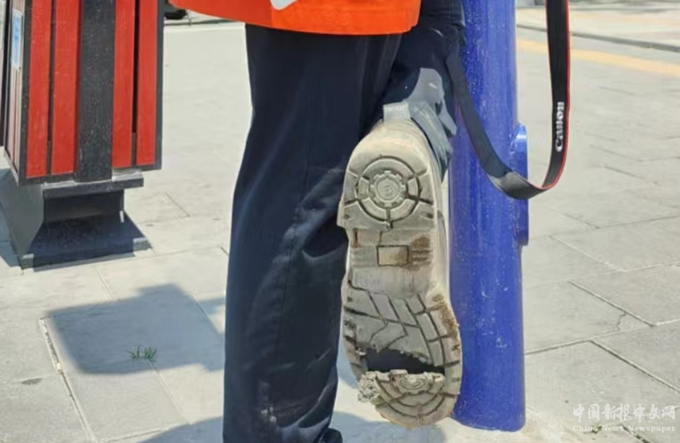 7月10日,在拍攝渤中19-6氣田Ⅰ期項目中心平臺裝船期間,我腳上的鞋子受地面高溫影響,磨損開裂。