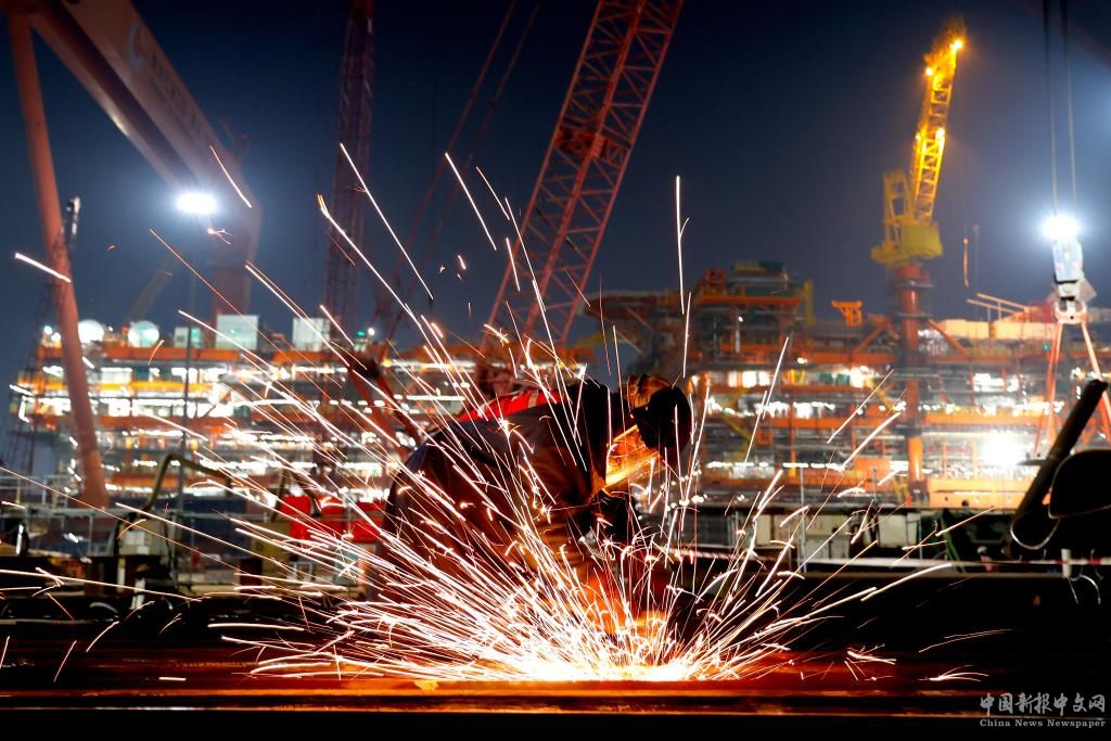 1月13日,在海油工程青島建造現(xiàn)場,工人對工件進行預制工作。