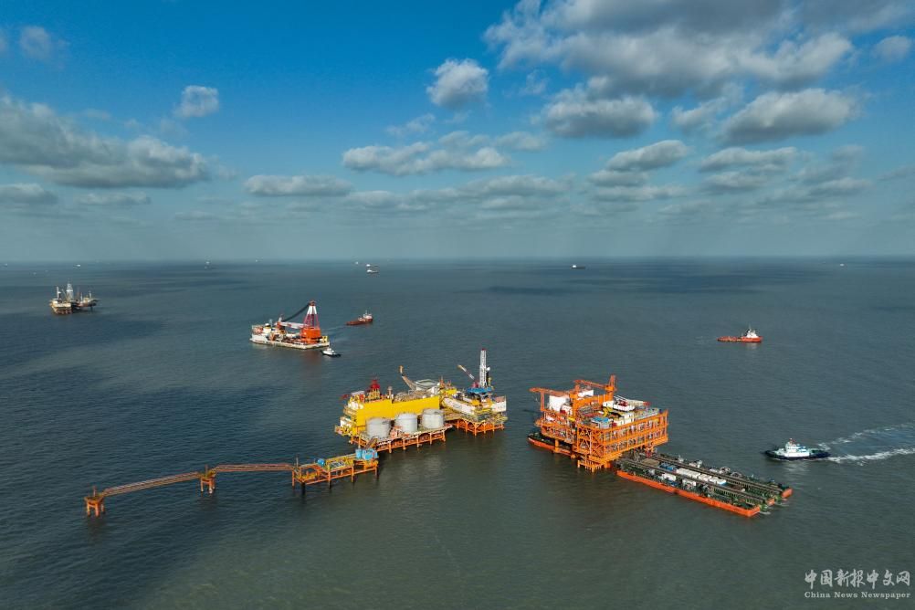 8月15日拍攝的渤中19-6氣田Ⅰ期項目海上平臺安裝現(xiàn)場(無人機照片)。
