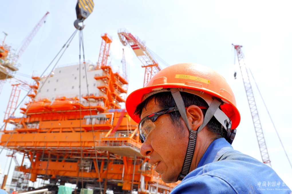 7月9日,工人在渤中19-6氣田Ⅰ期項目中心平臺作業(yè)現(xiàn)場施工,臉上掛滿汗珠。