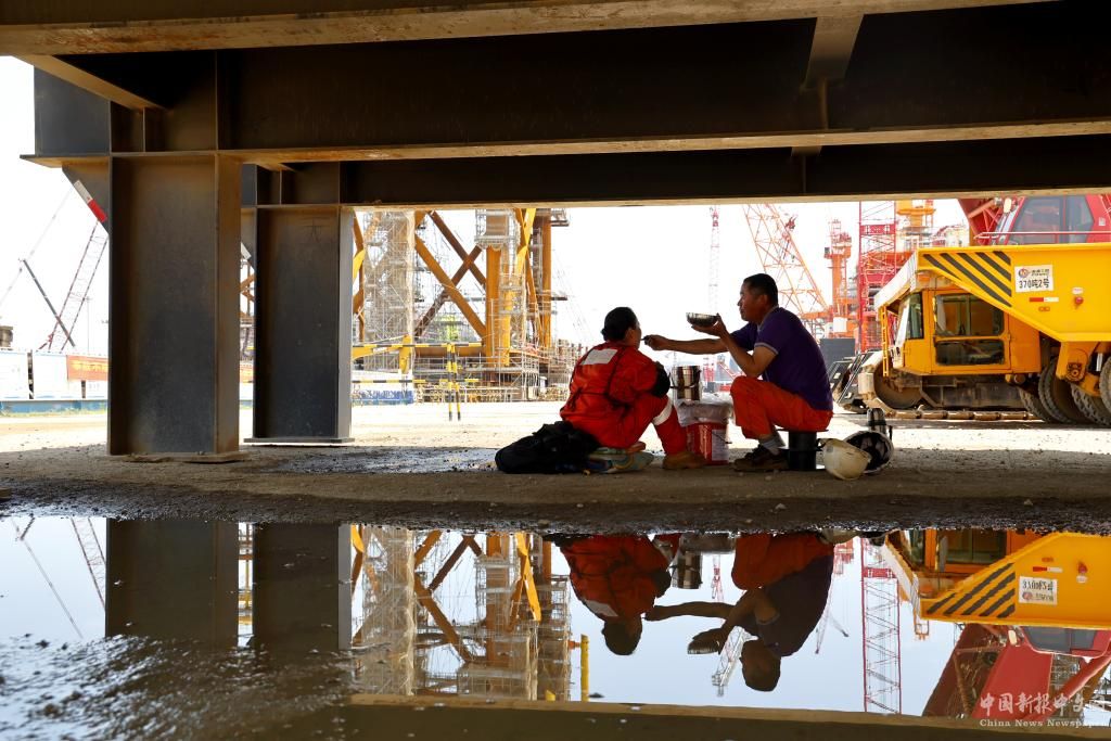 7月9日,渤中19-6組塊裝船作業(yè)現(xiàn)場高溫悶熱,一名施工人員在休息時喂妻子喝綠豆湯解暑。