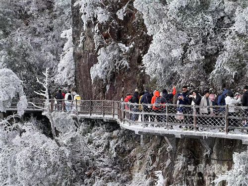 “霧凇花開(kāi)樹(shù)樹(shù)同,玉樹(shù)瓊枝美如畫(huà)”。近日受冷空氣影響,湖南莽山五指峰風(fēng)景區(qū)氣溫下降明顯,迎來(lái)霧凇、云海雙重奇景。入眼之處,銀裝素裹,美不勝收!莽山五指峰霧凇作為風(fēng)景區(qū)的冬季寶藏特色景觀,吸引了不少游客來(lái)山賞景。12月23日單日客流達(dá)近萬(wàn)人次。(記者 李志德)