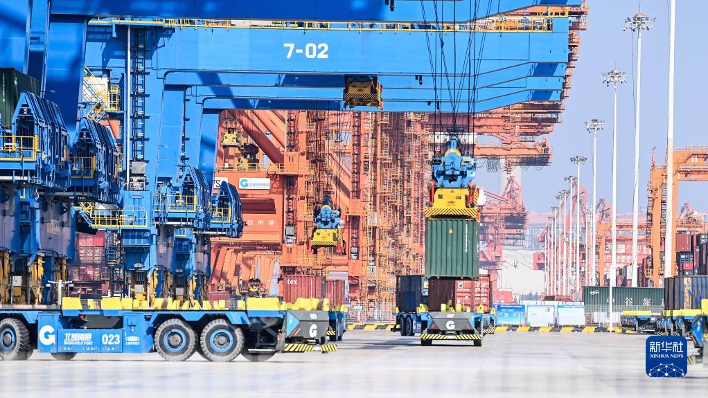 在廣西欽州港自動(dòng)化集裝箱碼頭,無(wú)人駕駛車輛在轉(zhuǎn)運(yùn)集裝箱(2023年2月25日攝)。新華社記者 張愛(ài)林 攝