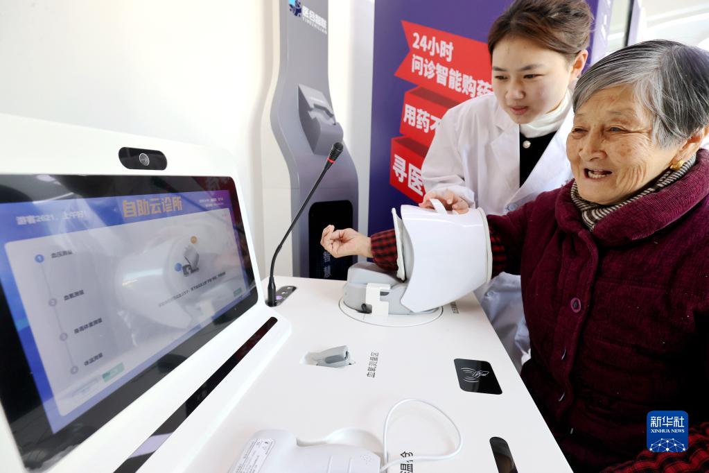 在浙江省湖州市德清縣阜溪街道興山未來(lái)社區(qū)居家養(yǎng)老服務(wù)中心,家庭醫(yī)生輔助社區(qū)老人進(jìn)行云問(wèn)診(2023年2月16日攝)。新華社發(fā)(謝尚國(guó) 攝)