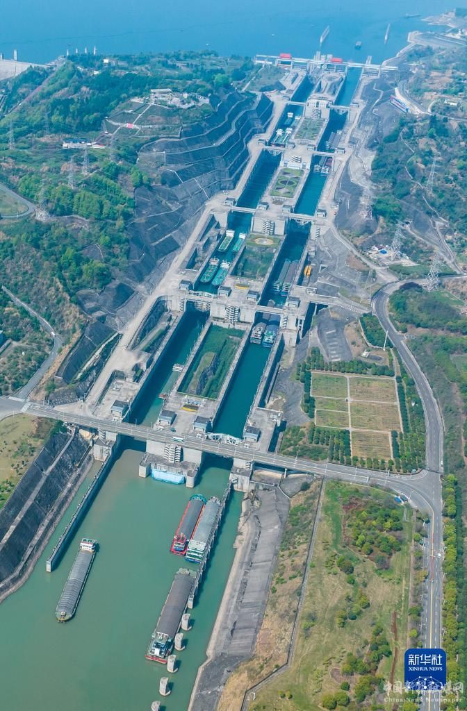 4月1日,船舶有序通過三峽雙線五級船閘(無人機(jī)照片)。