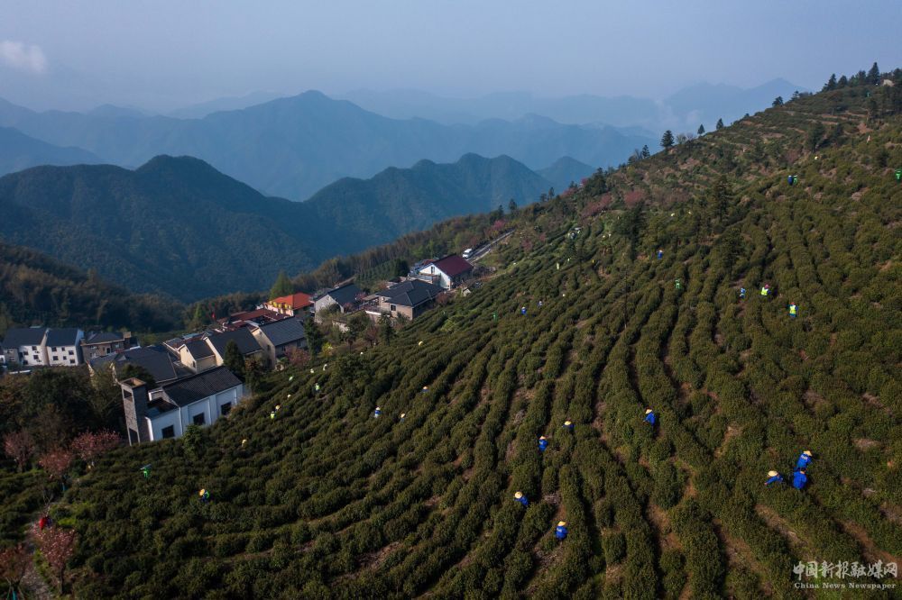 2023年4月7日,浙江省杭州市富陽(yáng)區(qū)里山鎮(zhèn)安頂村的茶農(nóng)在采摘安頂云霧茶(無(wú)人機(jī)照片)。新華社記者 徐昱 攝