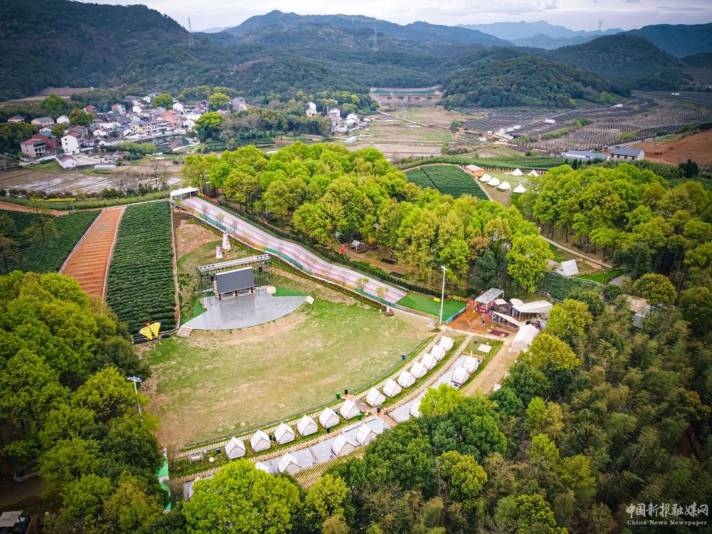 這是2023年3月29日拍攝的諸暨市楓橋鎮(zhèn)陽(yáng)春村陽(yáng)春山月游樂(lè)度假村(無(wú)人機(jī)照片)。當(dāng)?shù)赝ㄟ^(guò)閑置荒山土地流轉(zhuǎn)發(fā)展鄉(xiāng)村旅游,幫助當(dāng)?shù)卮迕窈痛寮w增收。新華社記者 江漢 攝