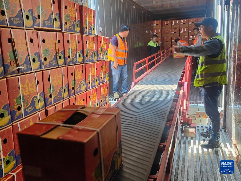 4月19日,工人在卸載到達(dá)昆明的水果。新華社發(fā)(秦文璐 攝)