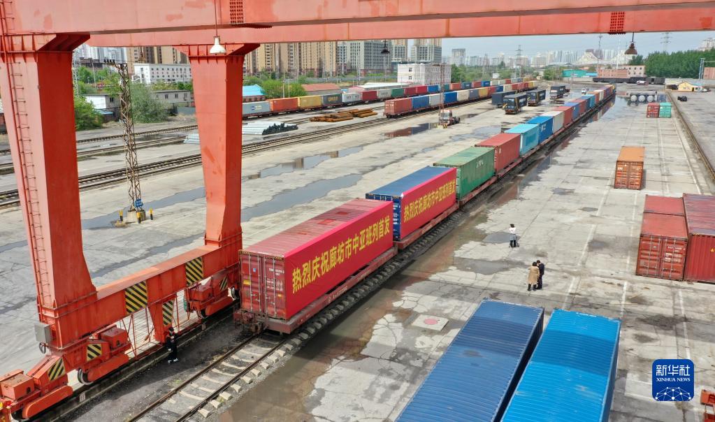 4月28日,首列中歐(中亞)班列(廊坊——塔什干)停靠在廊坊北鐵路貨場,準(zhǔn)備發(fā)車(無人機照片)。