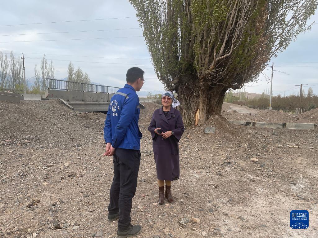 4月25日,在吉爾吉斯斯坦阿克奧隆村,中鐵五局工作人員王尹?。ㄗ螅┡c阿克奧隆村前村委會(huì)主任瑪伊拉姆·卡迪拉列娃在一處水渠旁交談。新華社記者 關(guān)建武 攝