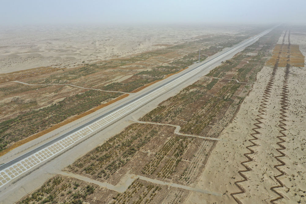 記者從中鐵第一勘察設(shè)計(jì)院集團(tuán)有限公司了解到,在被流動(dòng)沙丘侵害嚴(yán)重的和若鐵路沿線,建設(shè)者修建草方格近5000萬平方米,種植梭梭、紅柳、沙棘等灌木和喬木近1296萬株,林帶覆蓋面積超過11萬畝,這條“綠色走廊”成為防風(fēng)固沙的天然屏障。