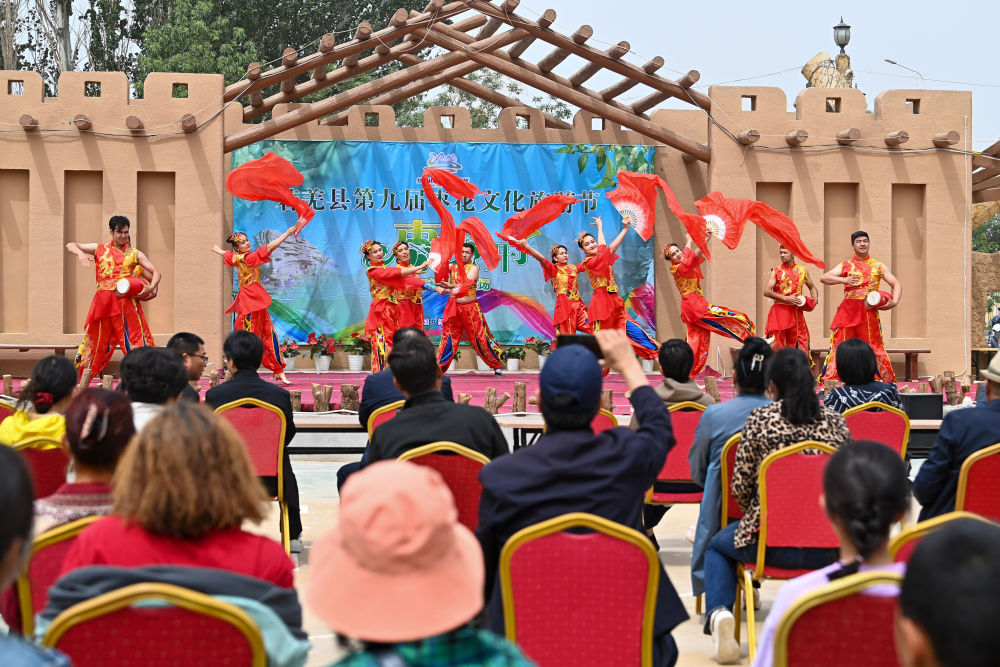 在新疆若羌縣瓦石峽鎮(zhèn),若羌縣樓蘭藝術(shù)團(tuán)的演員為參加棗花節(jié)的游客表演歌舞(5月28日攝)。新華社記者 丁磊 攝
