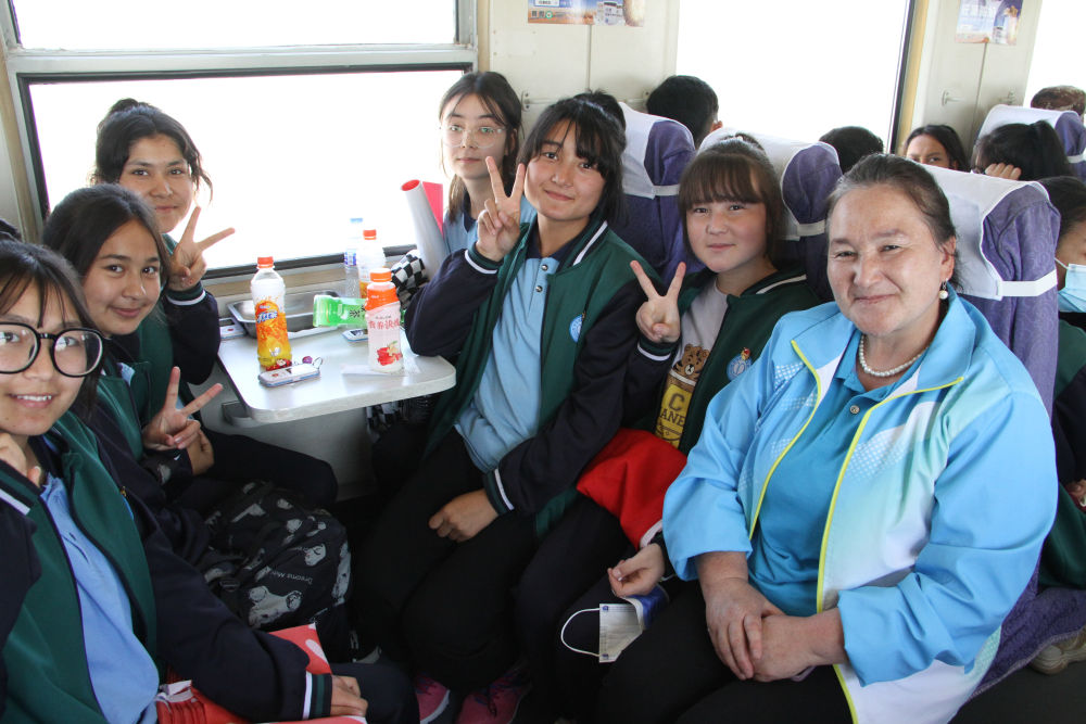 這是乘坐和若鐵路列車去庫爾班大叔家鄉(xiāng)研學(xué)的學(xué)生們和老師(5月29日攝)。新華社記者 劉紅霞 攝