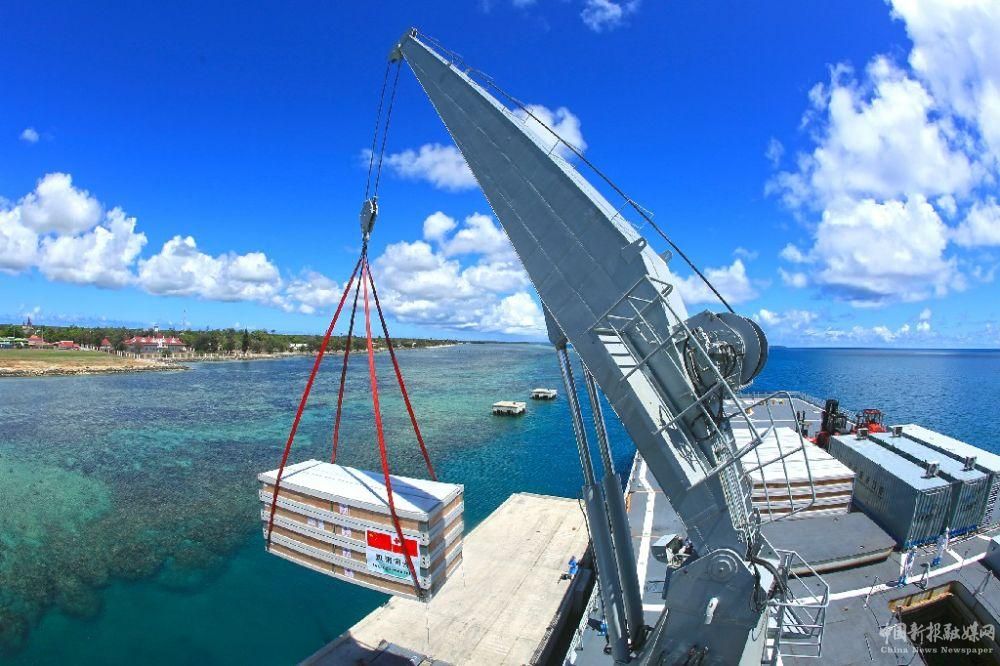 ↑赴湯加執(zhí)行運(yùn)送救災(zāi)物資任務(wù)的中國(guó)海軍艦艇編隊(duì)在努庫(kù)阿洛法港卸載移動(dòng)板房(2022年2月19日攝)。新華社發(fā)(薛成清 攝)