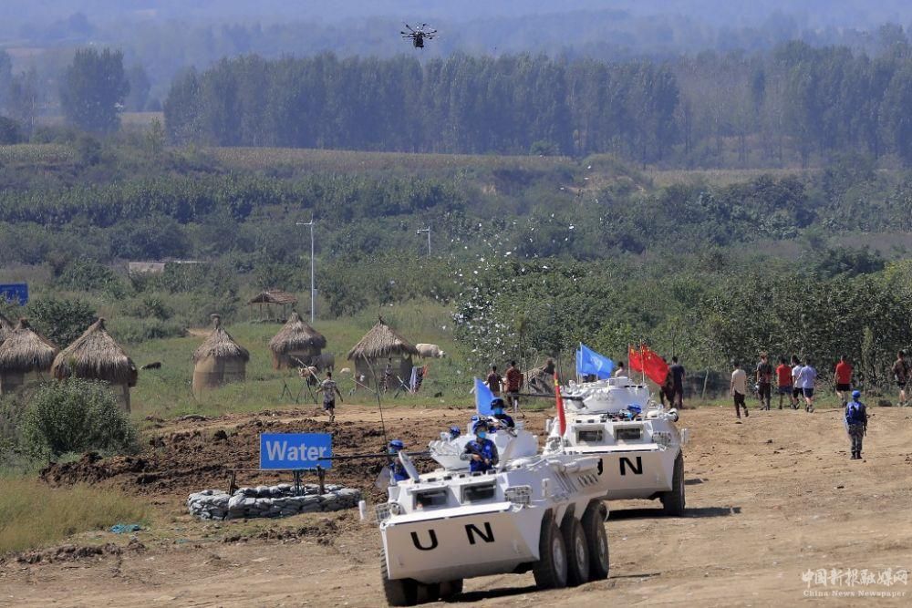 ↑2021年9月15日,在“共同命運(yùn)-2021”國(guó)際維和實(shí)兵演習(xí)綜合演練中,維和分隊(duì)采用無(wú)人機(jī)拋撒傳單宣傳和平理念。新華社記者 劉芳 攝