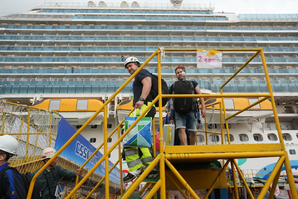 9月12日,參與試航的人員從首艘國產(chǎn)大型郵輪“愛達·魔都號”走下。中國日報記者 高爾強 攝