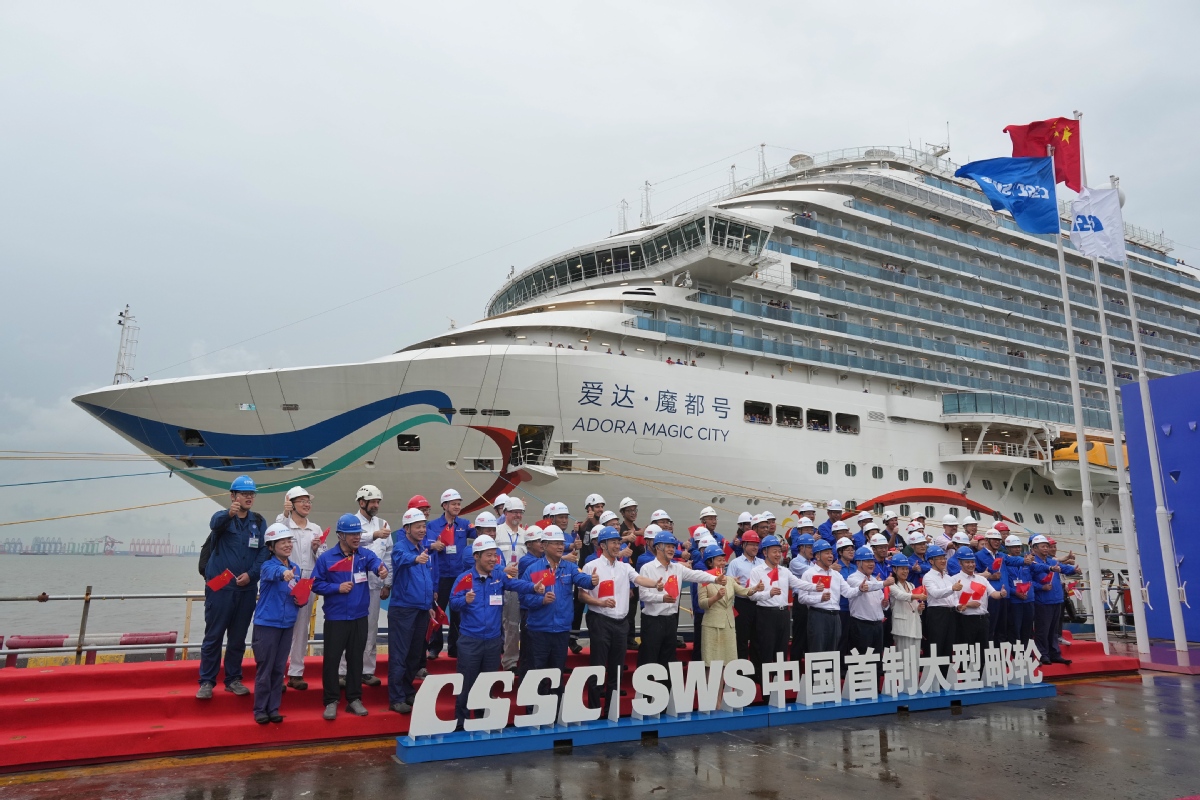 9月12日,船廠員工在首艘國產(chǎn)大型郵輪“愛達·魔都號”前合影留念。中國日報記者 高爾強 攝