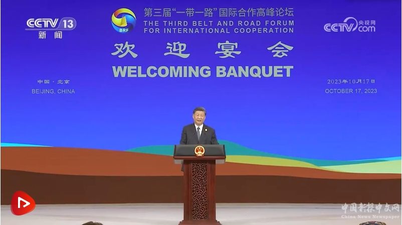 “共建‘一帶一路’走過(guò)了第一個(gè)蓬勃十年,正值風(fēng)華正茂,務(wù)當(dāng)昂揚(yáng)奮進(jìn),奔向下一個(gè)金色十年!”10月17日,習(xí)近平主席在第三屆“一帶一路”國(guó)際合作高峰論壇歡迎宴會(huì)上發(fā)表祝酒辭,精辟總結(jié)共建“一帶一路”倡議提出十年來(lái)取得的偉大成就,深情禮贊和平合作、開(kāi)放包容、互學(xué)互鑒、互利共贏的絲路精神,真誠(chéng)致敬共建“一帶一路”的參與者、建設(shè)者,提出了“奔向下一個(gè)金色十年”的美好目標(biāo)。