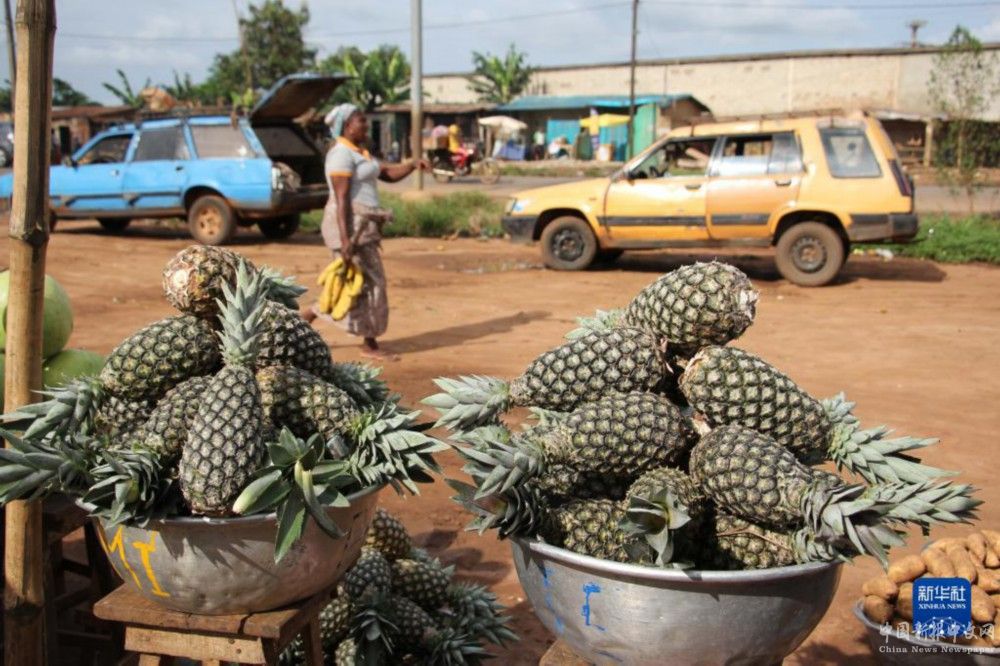 這是在貝寧“甜面包”菠蘿主產(chǎn)區(qū)澤鎮(zhèn)一家水果攤拍攝的菠蘿(2023年10月23日攝)。“甜面包”菠蘿是貝寧首個獲得非洲知識產(chǎn)權(quán)組織認證的地理標志產(chǎn)品。近日,在第六屆中國國際進口博覽會上,空運來華的1000公斤貝寧“甜面包”菠蘿首次與中國公眾見面。(塞拉芬攝)
