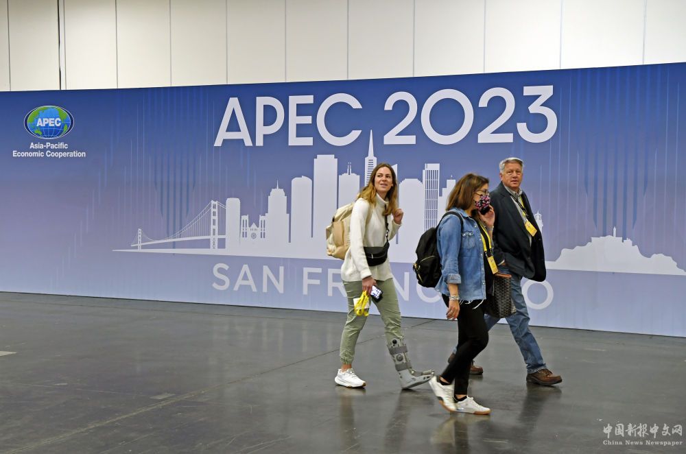 2023年11月12日,在美國舊金山,記者經(jīng)過2023年亞太經(jīng)合組織會議國際媒體中心內(nèi)的一幅海報。