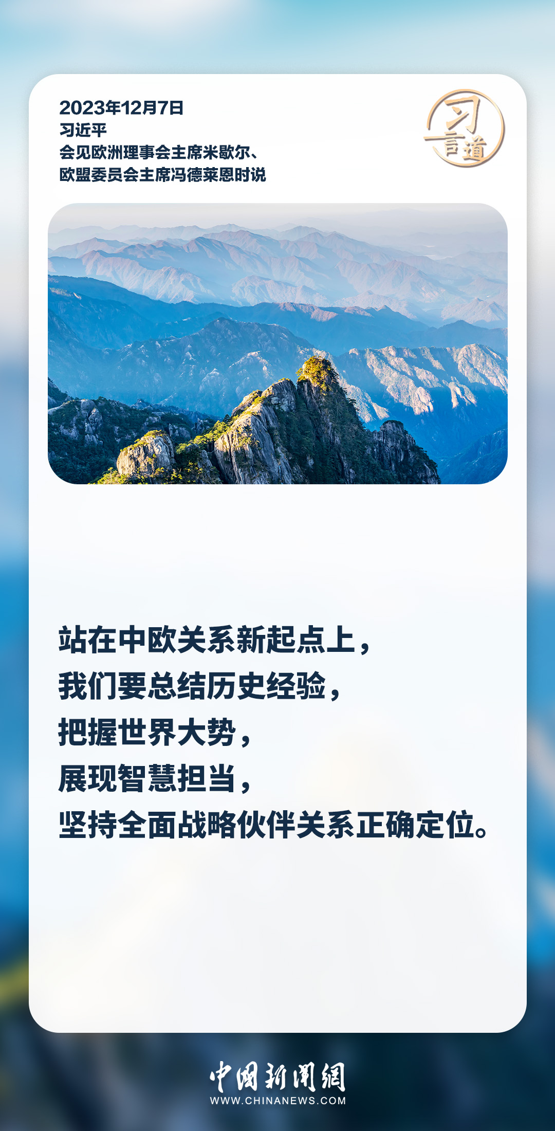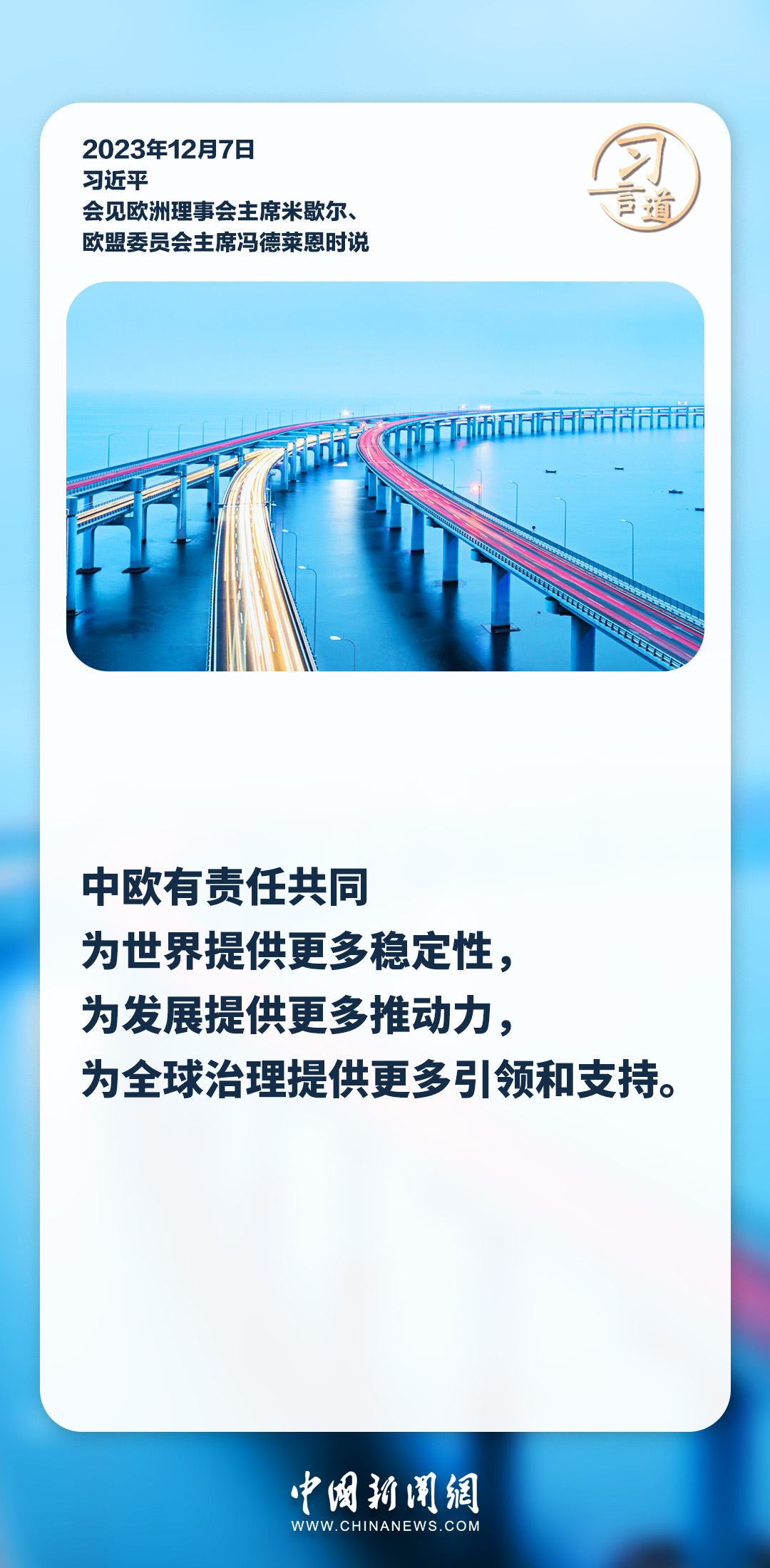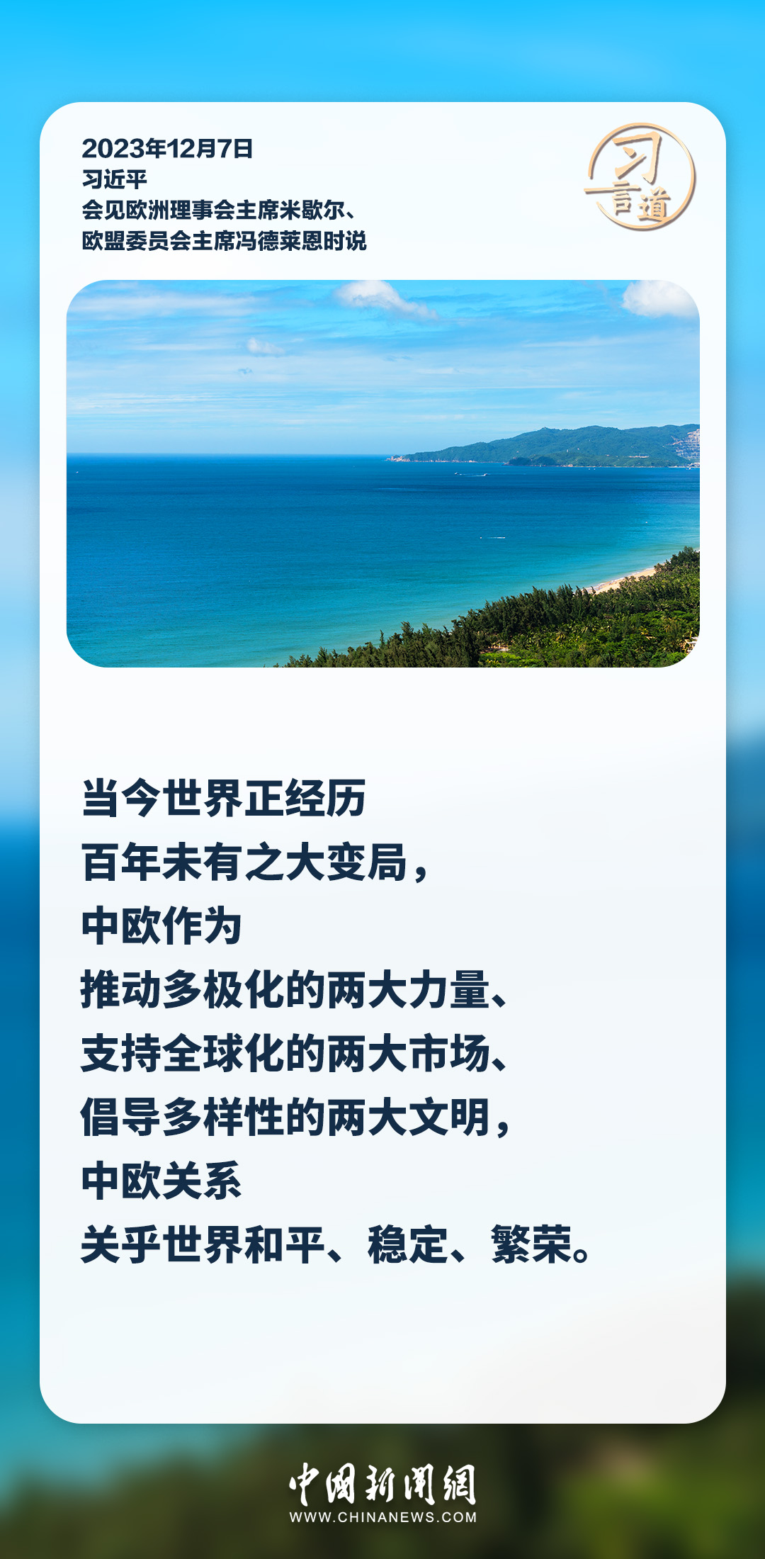 12月7日,國家主席習(xí)近平在釣魚臺(tái)國賓館會(huì)見來華舉行第二十四次中國—歐盟領(lǐng)導(dǎo)人會(huì)晤的歐洲理事會(huì)主席米歇爾和歐盟委員會(huì)主席馮德萊恩。習(xí)近平說——