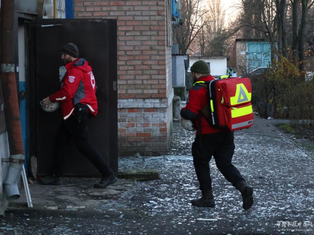 11月25日,烏克蘭紅十字會救援人員在基輔市一棟遭空襲的居民樓實施清理和救助工作。新華社發(fā)(羅曼·佩圖什科夫攝)
