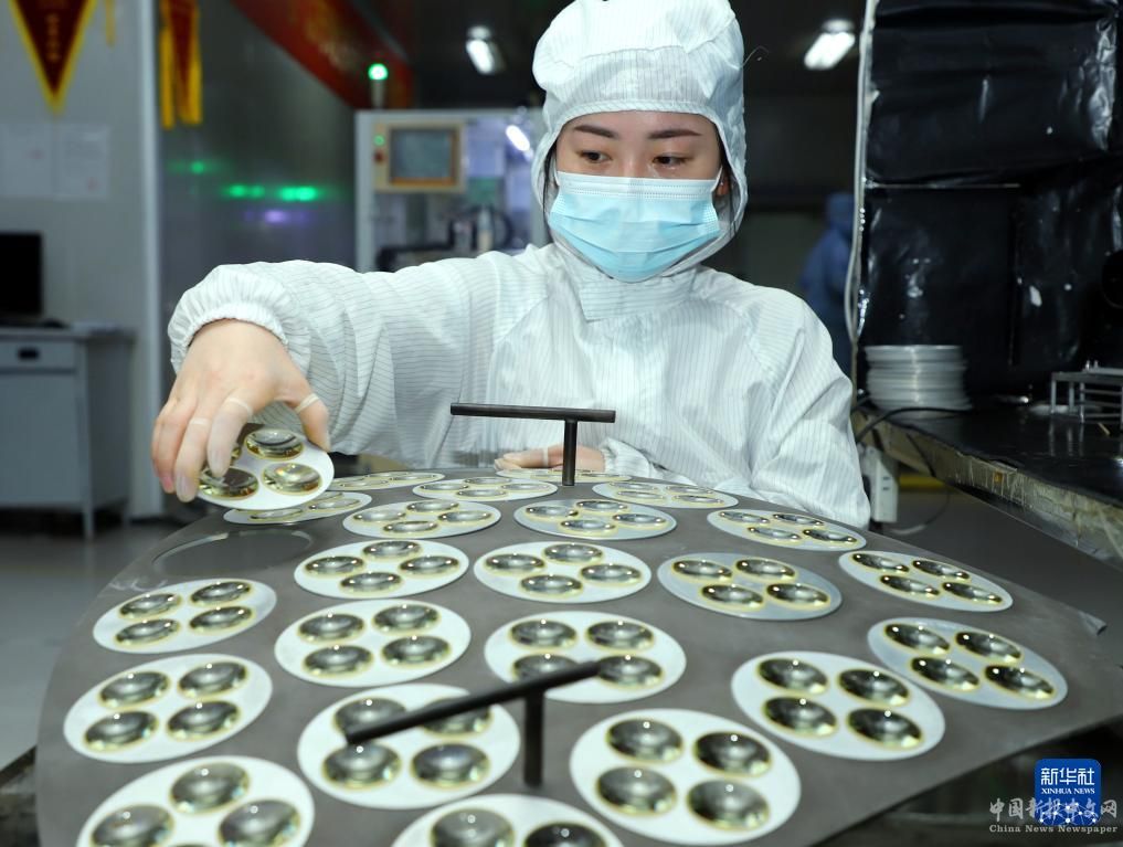 1月4日,在河南省南陽市中關(guān)村科技產(chǎn)業(yè)園一家光電公司生產(chǎn)車間,工人在進行鍍膜檢驗。