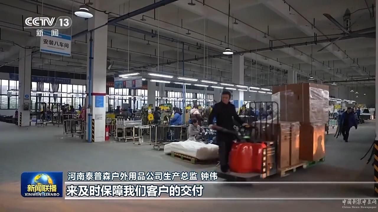 河南泰普森戶外用品公司生產(chǎn)總監(jiān) 鐘偉:把生產(chǎn)線全開,整合我們上下游供應(yīng)鏈的資源,來(lái)提高配套率,來(lái)及時(shí)保障我們客戶的交付。