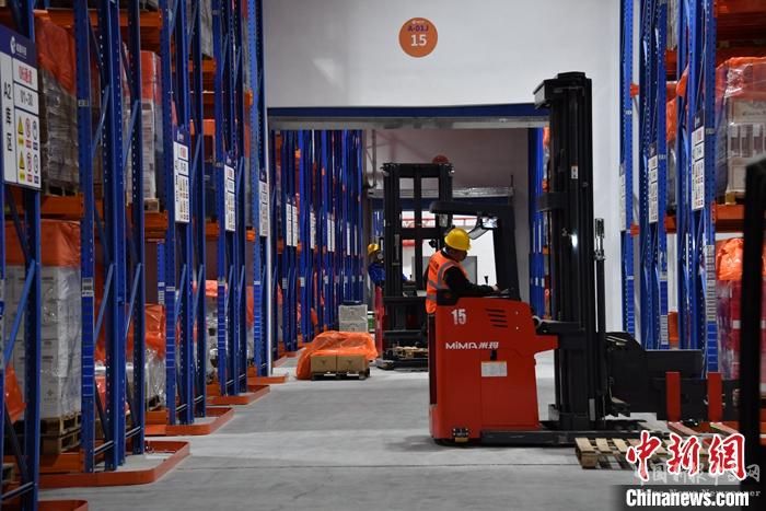 資料圖為2023年5月5日,北京大興國際機(jī)場(chǎng)綜合保稅區(qū),一公司工作人員盤點(diǎn)貨物。  中新社發(fā) 廊坊市委宣傳部 供圖