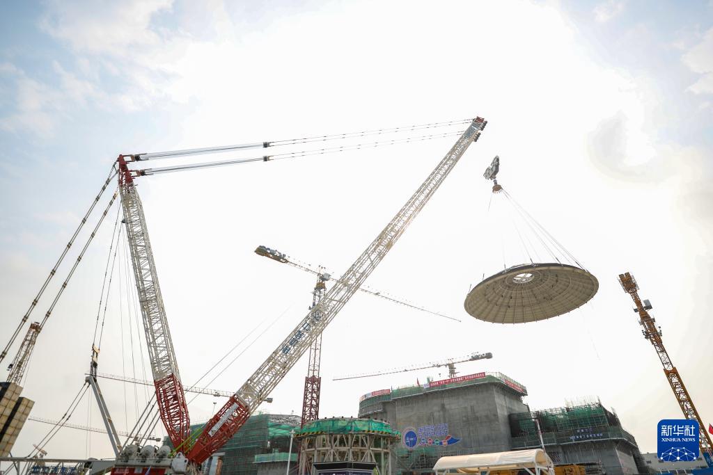 2月6日,海南昌江核電廠多用途模塊式小型堆科技示范工程“玲龍一號”外穹頂在進(jìn)行吊裝作業(yè)。