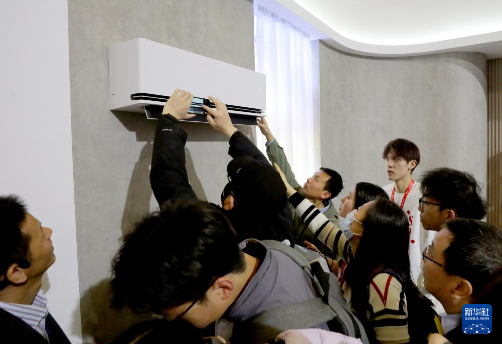 3月14日,參觀者在LG公司展臺(tái)上體驗(yàn)一個(gè)新款空調(diào)展品。