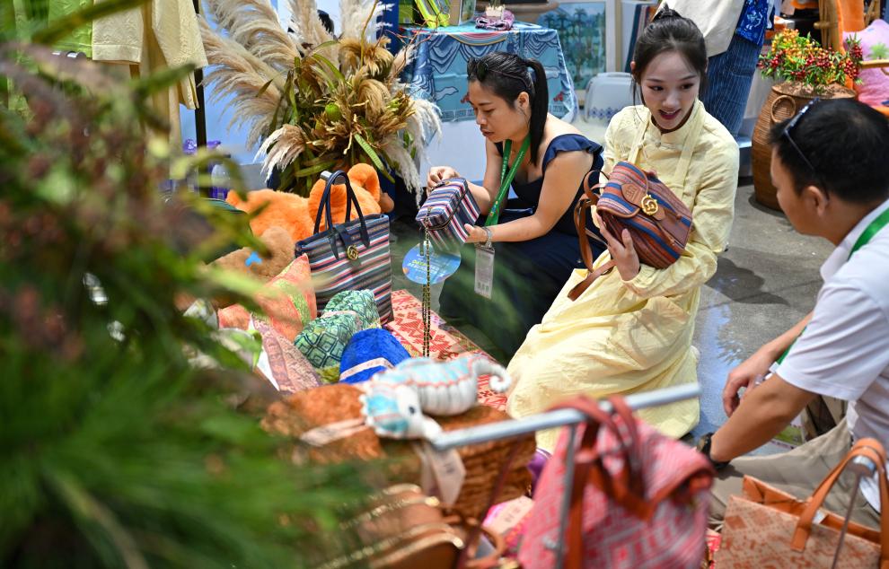 4月13日,觀眾在消博會現(xiàn)場選購設計融入海南黎族服飾元素的生活用品。新華社記者 郭程 攝