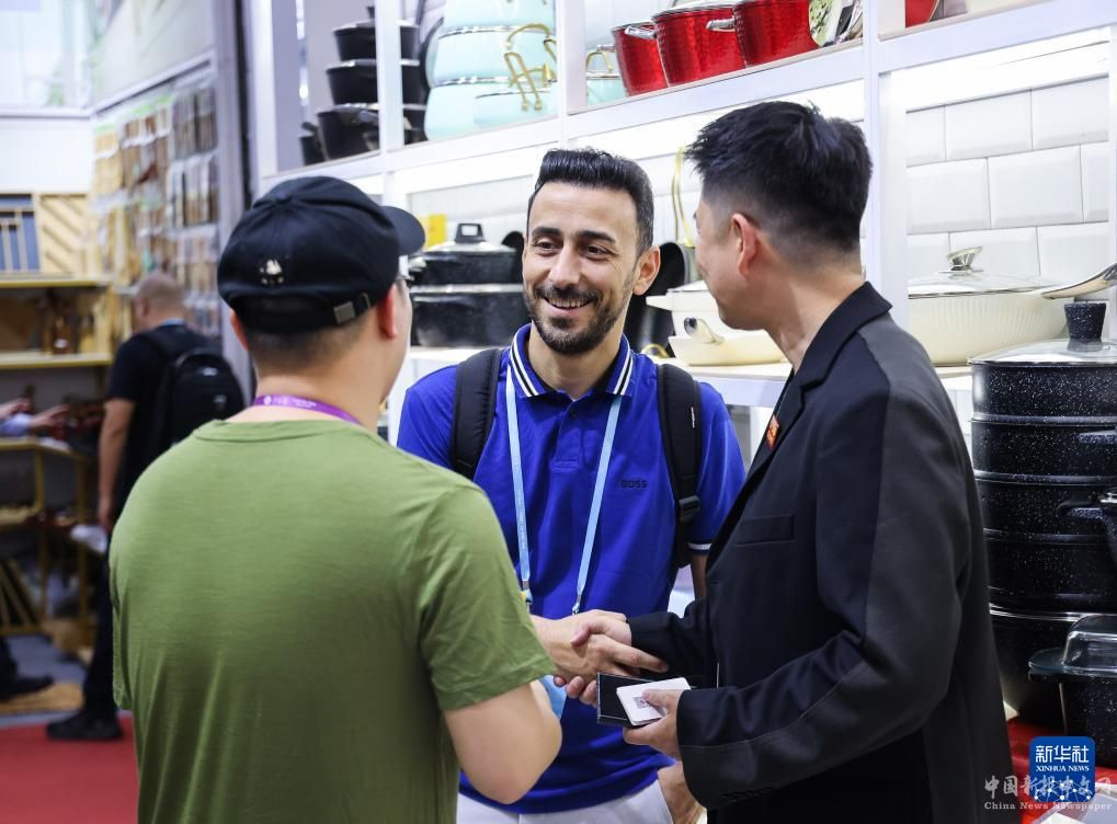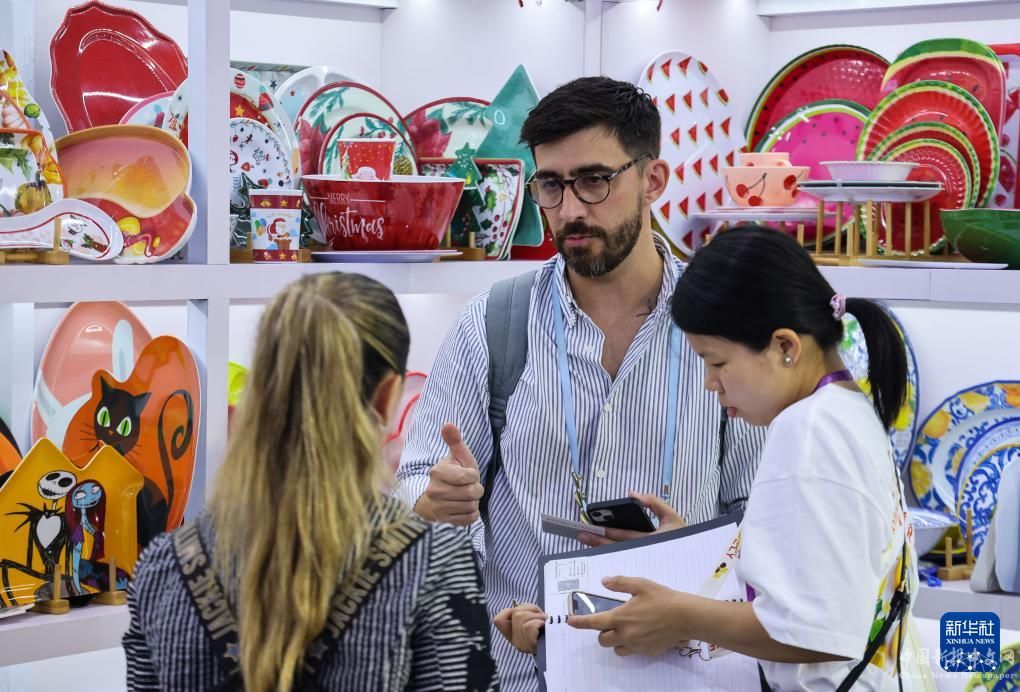 來自土耳其的采購商(中)在第135屆廣交會上洽談(4月24日攝)。