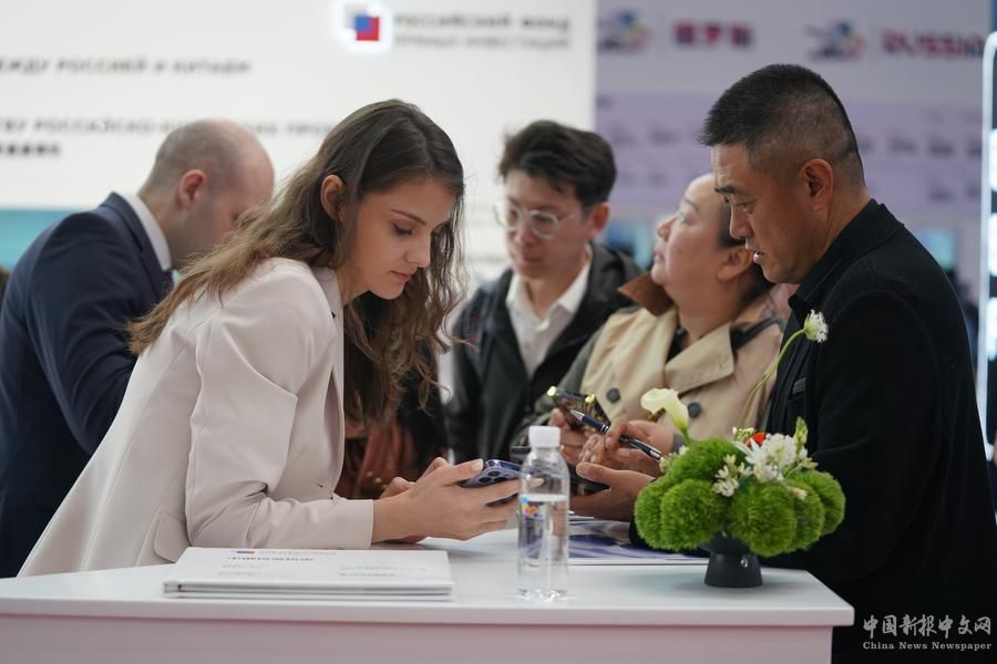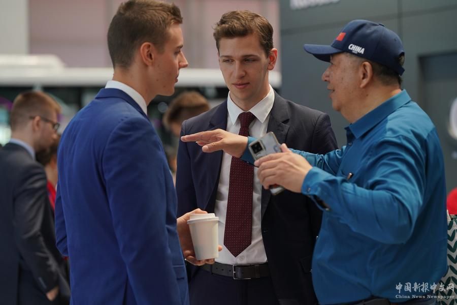 5月18日,在第八屆中俄博覽會(huì)展館內(nèi),參會(huì)者在進(jìn)行商務(wù)交流。新華社記者 王松 攝