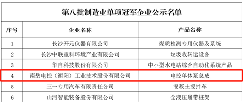 近日,國(guó)家工信部、中國(guó)工業(yè)經(jīng)濟(jì)聯(lián)合會(huì)發(fā)布第八批全國(guó)制造業(yè)單項(xiàng)冠軍企業(yè)名單,坐落在衡陽高新區(qū)的南岳電控(衡陽)工業(yè)技術(shù)股份有限公司(下文簡(jiǎn)稱南岳電控),憑借電控單體泵總成的卓越市場(chǎng)表現(xiàn),榮耀上榜!