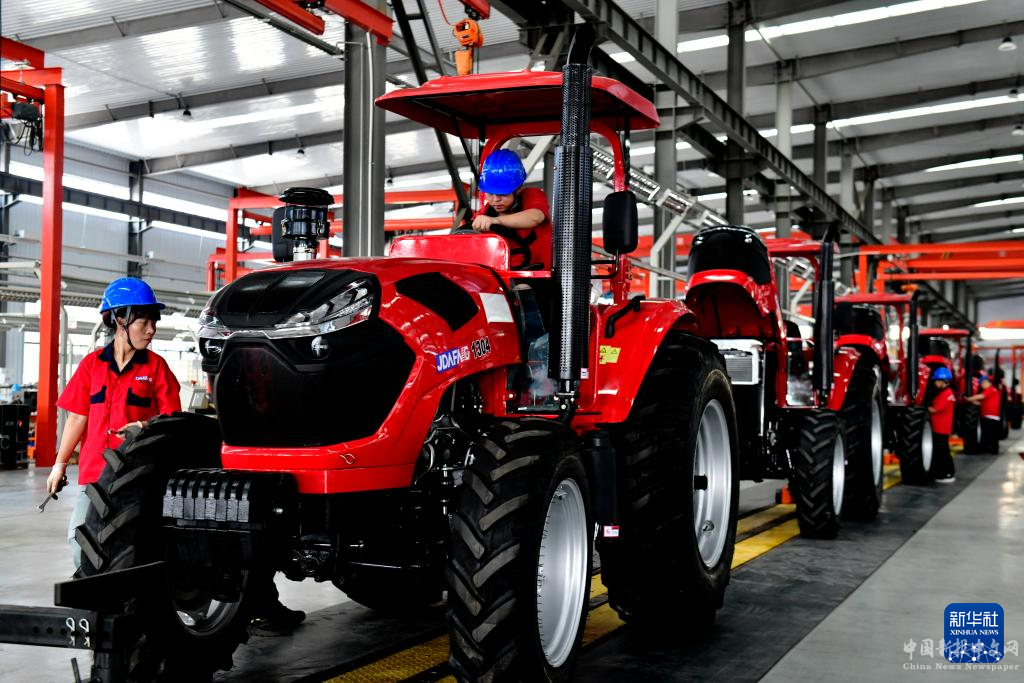 7月13日,在山東金大豐機械有限公司,工作人員在總裝線上生產(chǎn)農(nóng)機設備。