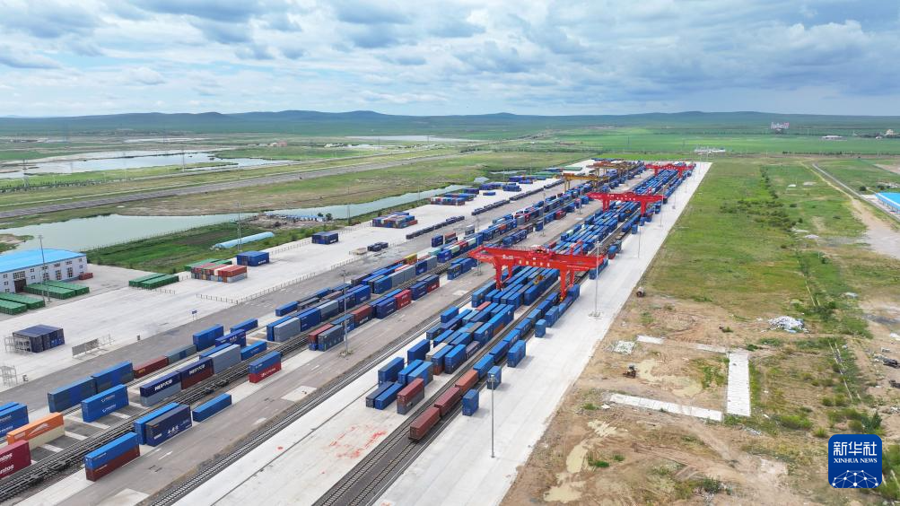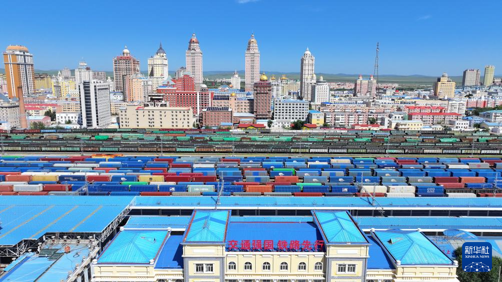 8月6日,中國鐵路哈爾濱局集團(tuán)有限公司內(nèi)蒙古滿洲里站貨運(yùn)車間在對回程中歐班列進(jìn)行換裝作業(yè)(無人機(jī)照片)。新華社發(fā)(黃旭攝)
