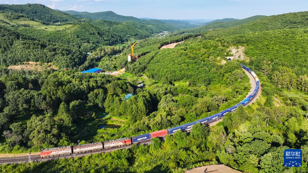 8月9日,一列裝載55箱的中歐班列駛出黑龍江同江北站(無人機(jī)照片)。新華社發(fā)(吳雨南攝)