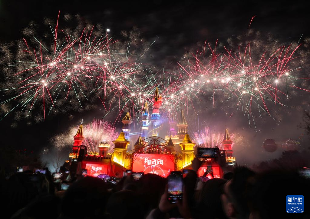 1月1日,游客在沈陽方特歡樂世界觀看煙花表演。